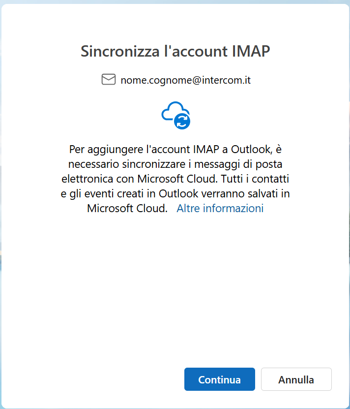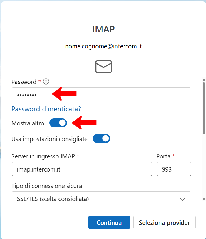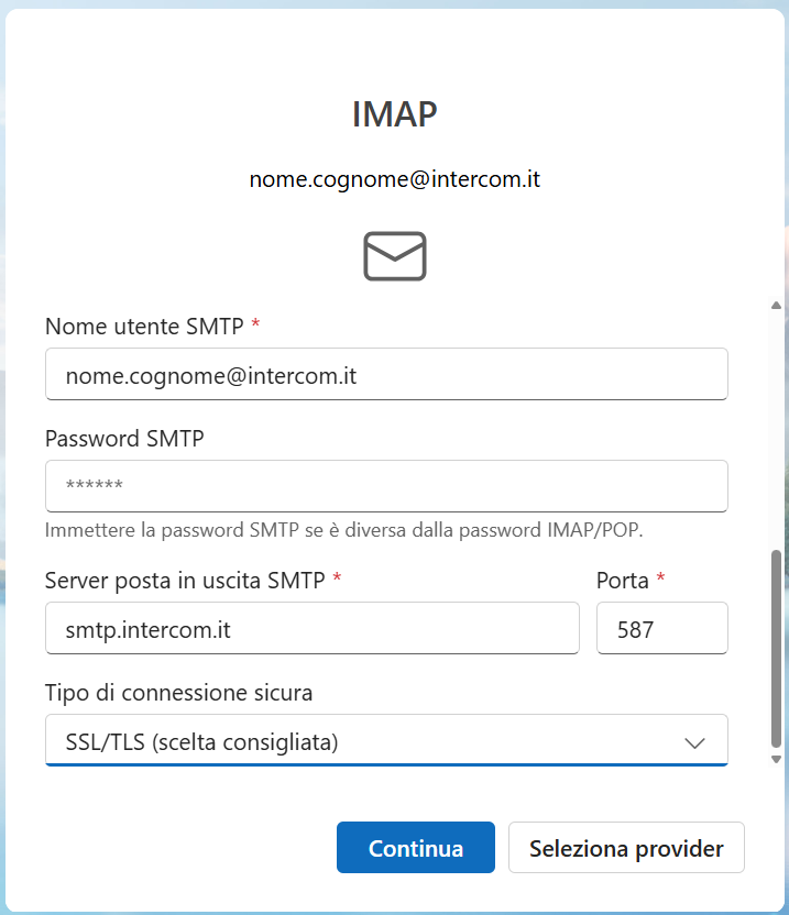 imap.intercom.it993SSL/TLSnome.cognome@intercom.it (il proprio indirizzo mail)(la password della mail)smtp.intercom.it587SSL/TLSClicca su Continua